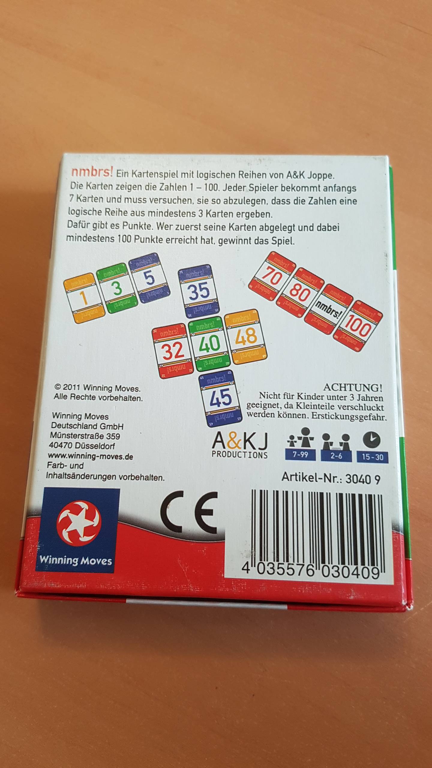 Die Spieler erhalten 7 Handkarten, die restlichen Karten kommen als Abnahmestapel in die Mitte. Jeder Spieler hat zu Beginn ein Guthaben von 50 Punkten. Wer an der Reihe ist, nimmt eine Karte vom Stapel und versucht dann, möglichst viele seiner Handkarten in einer oder mehreren logischen Reihen aus mindestens 3 Karten abzulegen, z.B. 21-24-27...(3) oder 14-20-26...(6). Dabei darf man an bestehende Reihen anlegen, Karten in Reihen einfügen und Reihen miteinander verbinden. 4 Joker helfen auch schwierige Karten noch unterzubringen. Jede Karte ist entweder 1, 2 oder 3 Punkte wert. Nach dem Ablegen zählt der Spieler die Punkte seiner abgelegten Karten zu seinem Guthaben dazu. Wenn ein Spieler alle seine Karten ablegen konnte, ist die Runde zu Ende. Die Punkte der Karten, die die übrigen Spieler auf der Hand behalten haben, werden von ihrem Guthaben abgezogen. Man spielt so viele Runden, bis ein Spieler 100 Punkte erreicht hat. Dazu gibt es Regeln für eine Vereinfachung und für Fortgeschrittene.