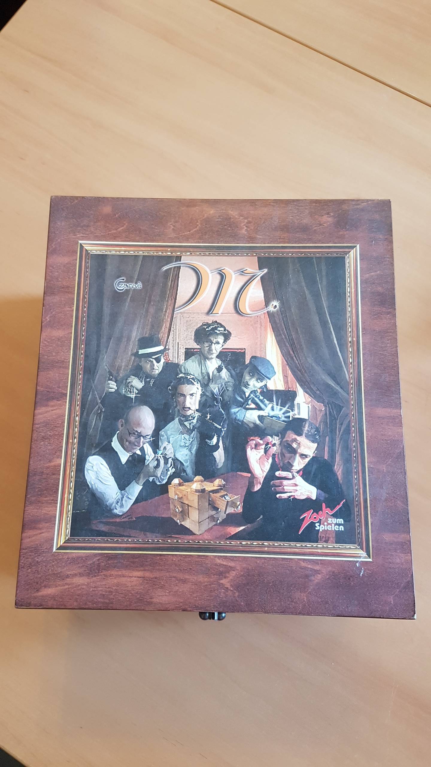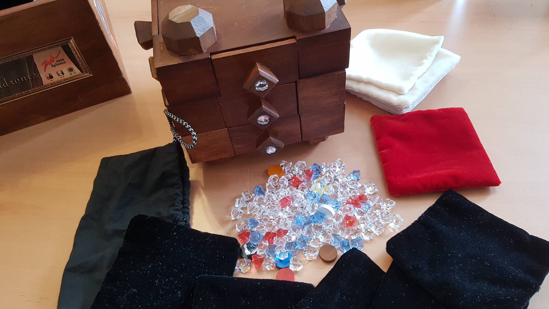 Holz. Es besteht aus drei Ebenen mit jeweils vier Schubladen. Die Schichten können um eine zentrale Achse gedreht und die gesamte Box auf den Kopf gestellt werden. Alle 12 Schubladen sind so konzipiert, dass sie oben und unten mit Edelsteinen gefüllt werden können. Das gilt auch für die Geheimfächer, in denen der besonders wertvolle "Clunker" liegt. . Die Spieler versuchen, die Kiste mit Diamanten zu füllen, als Schmuggler, um heiße Waren loszuwerden oder als Meisterdieb, um den wertvollen Inhalt der Schubladen zu plündern. und Detektive wollen auch bezahlt werden. Vorsicht ist die Mutter der Schmuckschatterie, denn oft fallen die Edelsteine am boden der Schublade heraus, anstatt im oberen Fach leicht erreichbar zu sein.