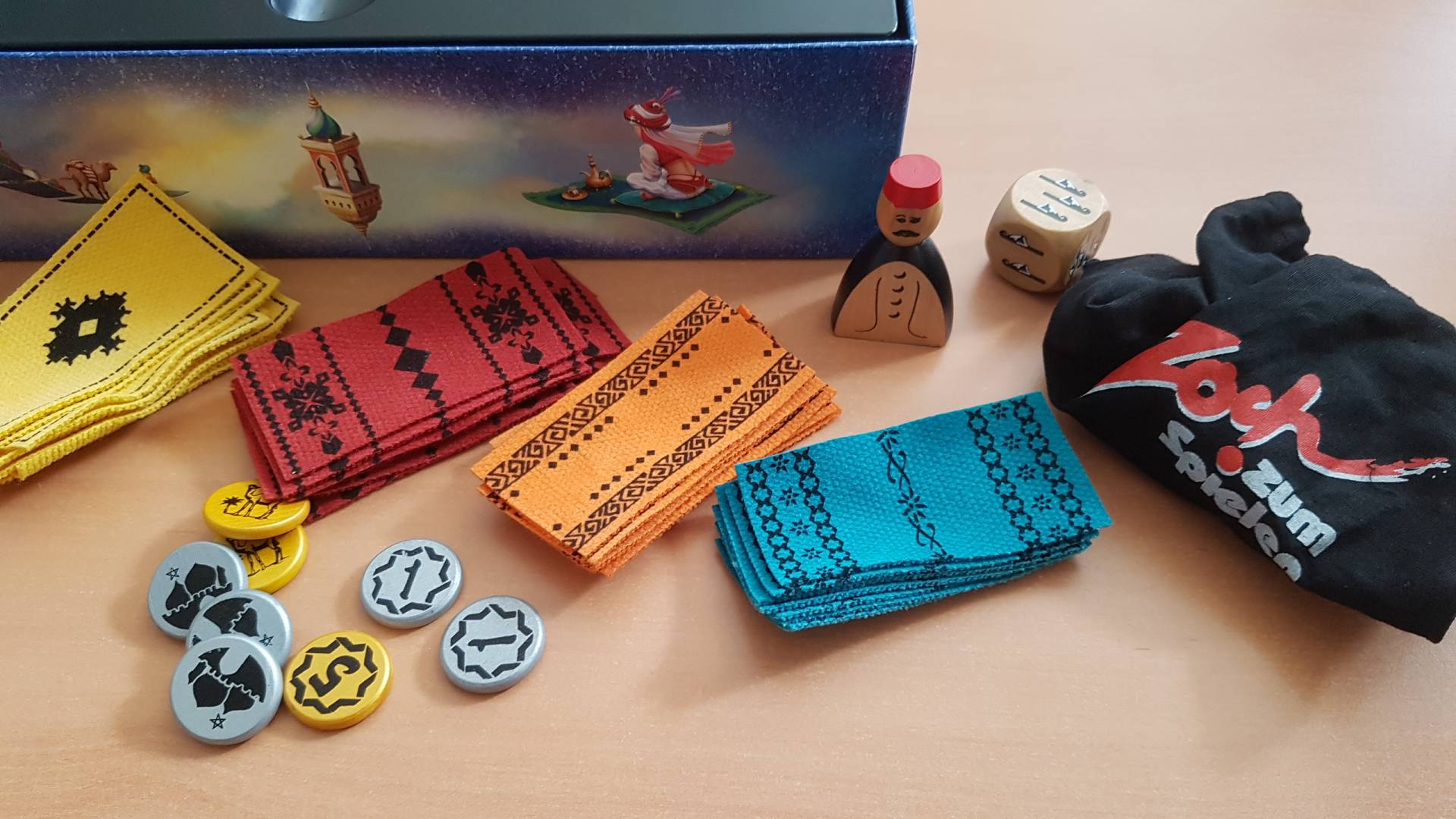 Die dreidimensionale Teppichauslage aus echten Textilien haucht dem Spielplan die lebendige Atmosphäre eines morgenländischen Basars ein.