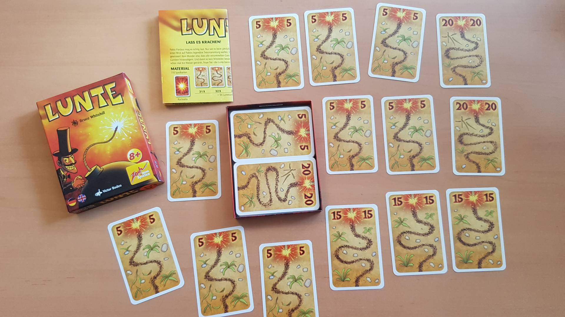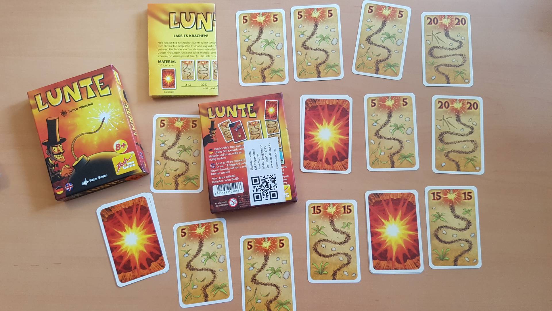 Gleich knallt’s! Oder doch nicht? … Die Spieler legen Lunten aus. Je länger eine Zündschnur abbrennt, desto größer wird der Knall. Allerdings kann es jeder Spieler nur zweimal im Spiel krachen lassen. Und so spekulieren alle auf die explosivsten Augenblicke. Doch kurz bevor es so weit ist, sabotieren sich die Sprengmeister nur allzu gerne gegenseitig mit einer Riesenladung Löschwasser. Lunte ist ein zündendes Kartenspiel mit einer knisternden Extraportion Nervenkitzel.
