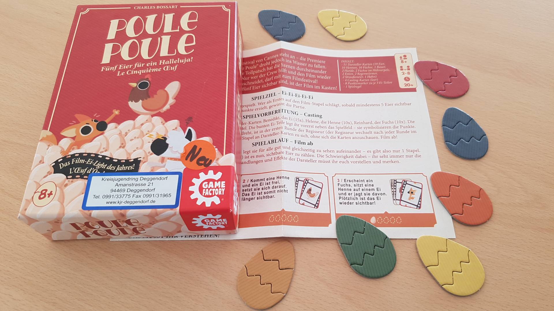 Das Filmfestival in Cannes steht an – die Premiere von „Poule Poule“ droht ins Wasser zu fallen. „Wuff“ der Tollpatsch hat die Szenen durch- einandergebracht! Die Aufgabe der Spieler ist es nun, den Film wieder korrekt zusammenzuschneiden. Erst wenn fünf Eier sichtbar sind, ist der Film im Kasten. Nur wer den Überblick beim Filmset-Chaos behält, richtig zählt und schnell reagiert, darf mit zum Festival.
