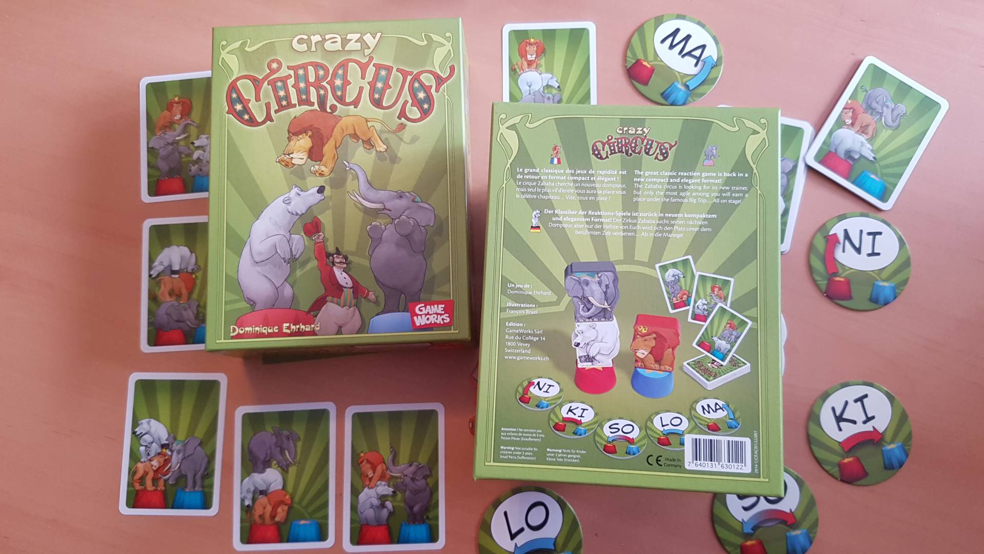Crazy Circus ist in neuem, kompaktem Format zurück. Drei Zirkustiere sind zu zähmen. In jeder Runde wird eine Aufgabenkarte gezogen. Es stehen fünf verschiedene Befehle zur Verfügung, um die abgebildete Position einzunehmen. Wer zuerst den richtigen Befehl artikulieren kann, hat die Runde gewonnen.