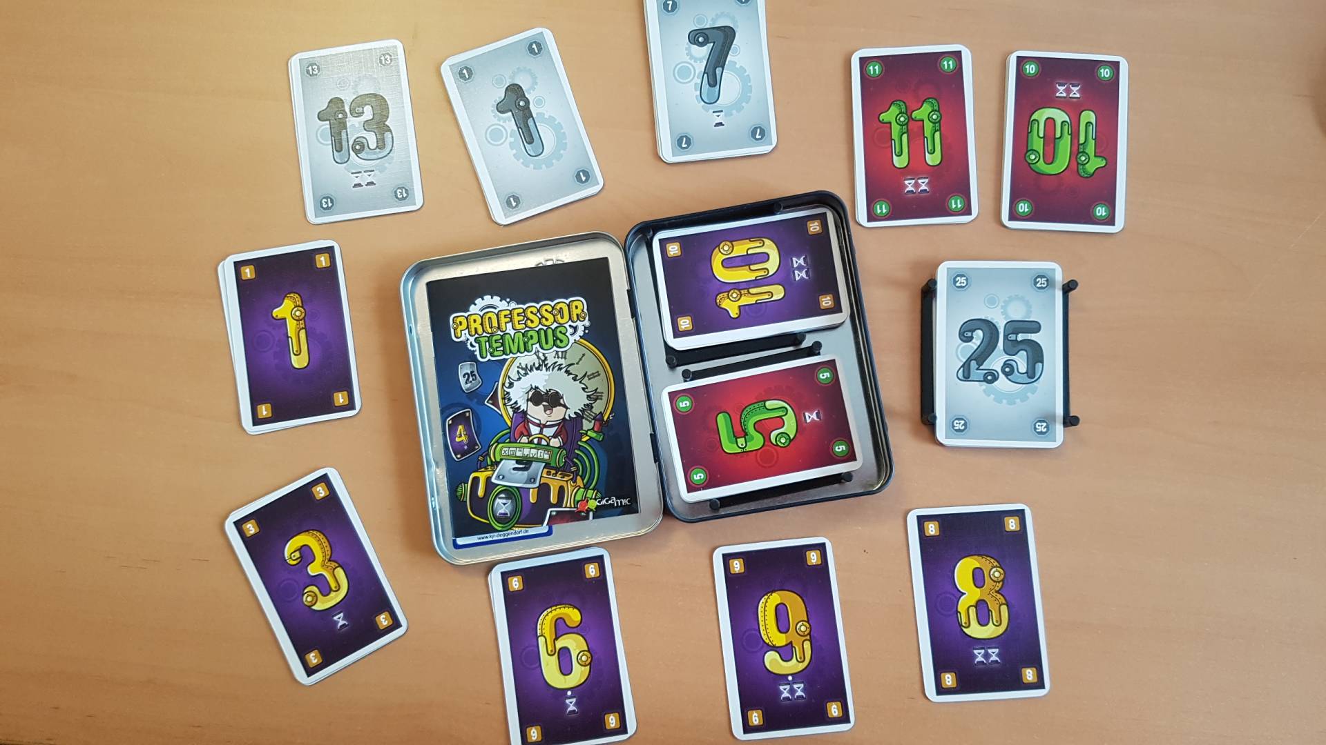 Professor Tempus spielt mit drei Kartenstapeln. Durch Richtungskarten wird bestimmt, ob aufsteigend oder absteigend abgelegt werden kann. Die Farbe bestimmt die erste abgelegte Karte. Je nach dem welcher Spieler ablegt, wandert der Kartenhalter. Wer die letzte mögliche Karte eines Stapels legt, gewinnt die Punkte.