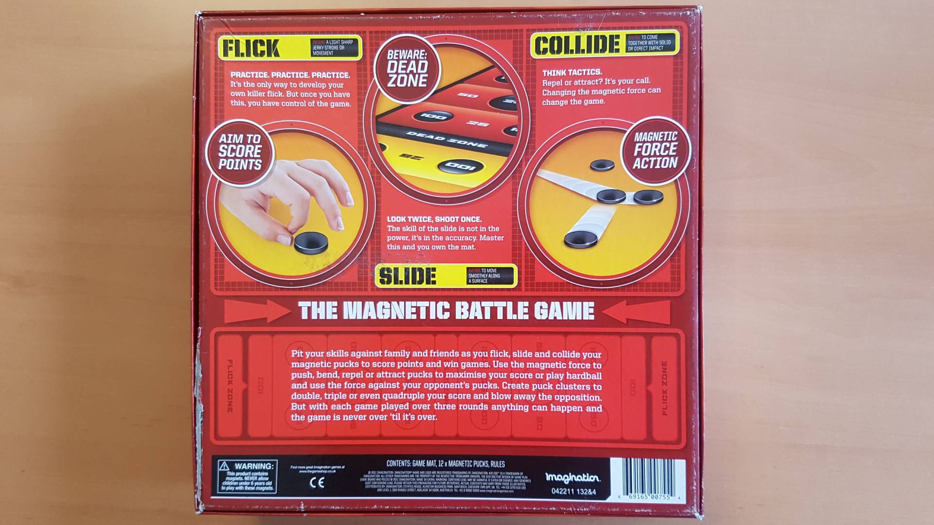 für die ganze Familie Das Ziel des Spiels ist es, die magnetischen Spielsteine auf die andere Seite der Spielmatte zu schnippen, zu stoßen oder gleiten zu lassen und dadurch Punkte zu gewinnen. Abwechselnd schnippen die Spieler ihre Spielsteine auf die Matte und versuchen dabei, ihre Spielsteine auf den Feldern unterzubringen, die mit Punktewerten markiert sind.