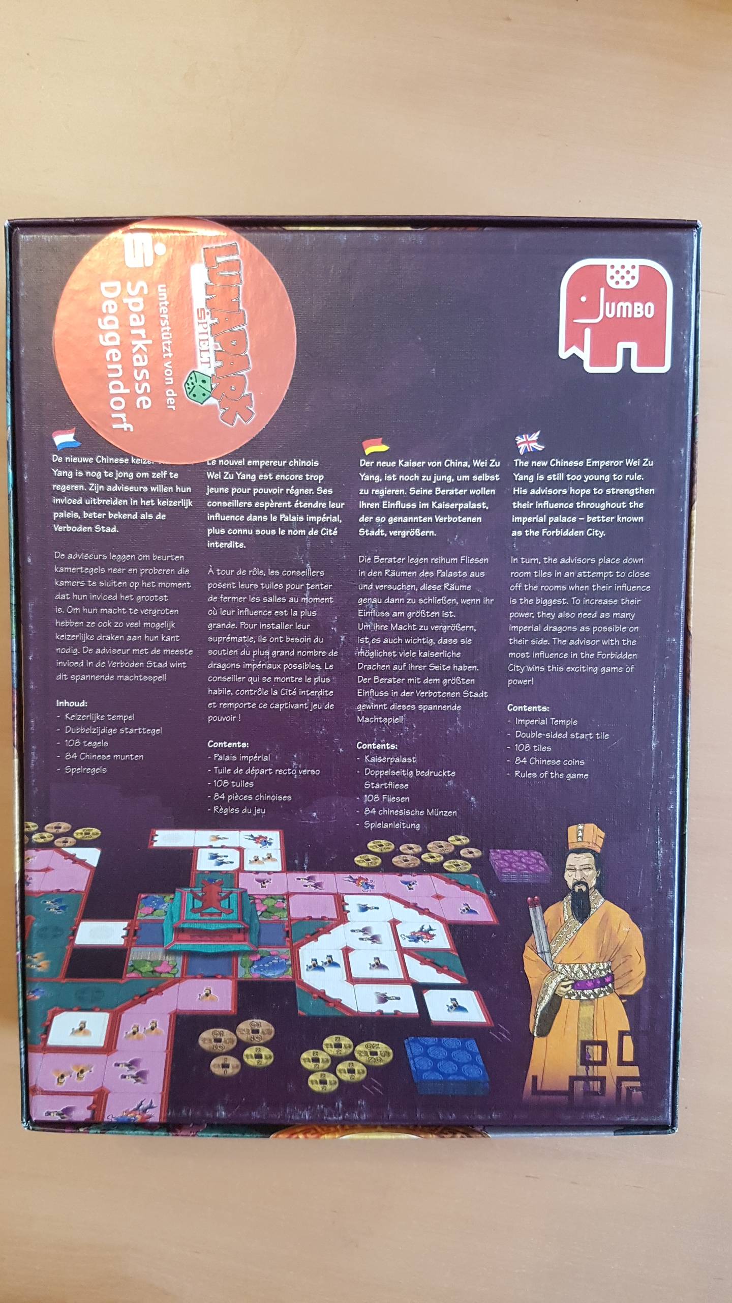 Der neue Kaiser von China, Wei Zu Yang, ist noch zu jung, um selbst zu regieren. Als Berater versuchen die Spieler ihren Einfluss im Kaiserpalast, der so genannten Verbotenen Stadt, zu vergrößern. Die Berater legen der Reihe nach Bodenfliesen in den Räumen des Palasts und versuchen auf diese Weise die Räume zu schließen, wenn ihr Einfluss am größten ist. Dabei müssen sie möglichst viele kaiserliche Drachen auf ihrer Seite haben. Der Berater, dem dies am besten gelingt, erhält die Macht über die Verbotene Stadt und gewinnt dieses spannende Eroberungsspiel.Ein taktisches Legespiel von Reiner Knizia mit Illustrationen von Paul Windle Design.