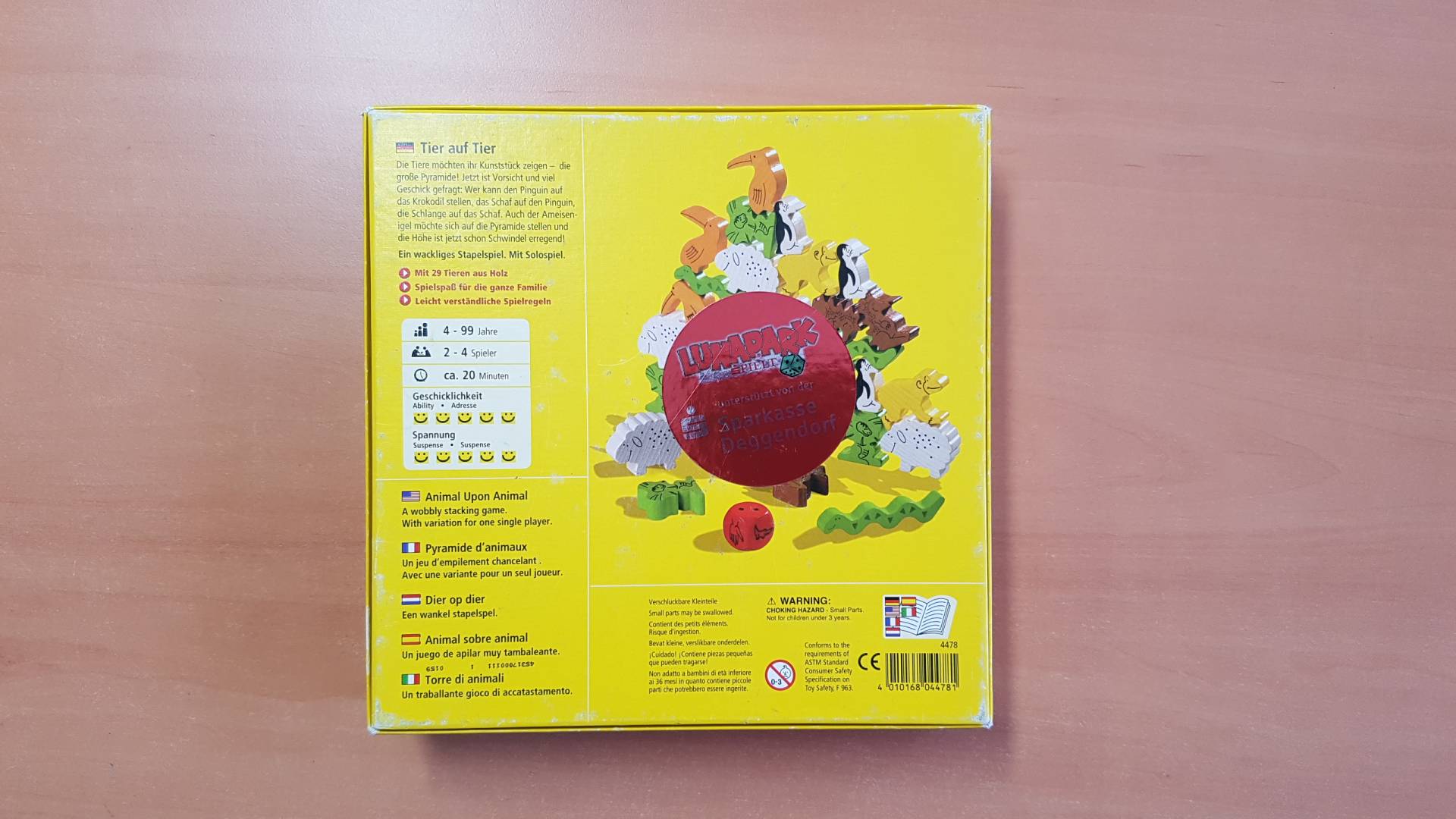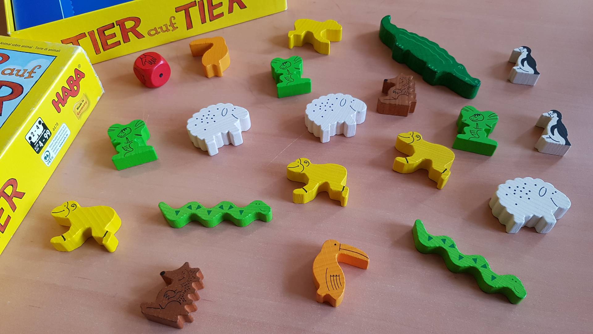 Tier auf Tier ist ein wackeliger Stapelspaß von HABA, der alle begeistern wird. Mutig versucht der kleine Pinguin den Gipfel der Tierpyramide zu erklimmen und startet seinen Aufstieg auf dem Rücken des Krokodils. Tier auf Tier kommen immer mehr dazu, da steht das Schaf auf dem Tukan und der Affe auf dem Igel. Wer schafft es sich auch oben an der Spitze zu halten? Das spannende Stapelspiel Tier auf Tier schult das vorausschauende und dreidimensionale Denken, denn das wird benötigt, um die Tiere geschickt aufeinanderzusetzen. Die großen Tiere aus Holz lassen sich leicht greifen und das Stapeln schult die Feinmotorik. Daneben wird die Auge-Hand-Koordination gefördert. Das aufregende HABA-Spiel sorgt für immer wieder aufs Neue für jede Menge Spielspaß.