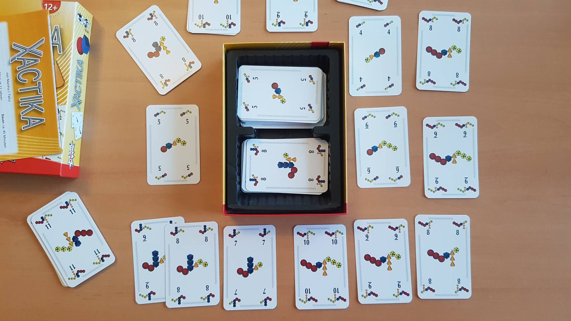 Xactika® – Hier stechen Zahlen und Symbole! Die höchste Zahl gewinnt? Nicht bei Xactika®! Hier ist es nicht nur wichtig, die höchste Karte abzulegen – auch die Symbole auf den ausgespielten Karten entscheiden darüber, ob man einen Stich gewinnt oder nicht. Klug gespielt gewinnt bei diesem Stichspiel auch ein niedriger Wert einen Stich. Also auf geht’s in den Kampf und Zahlen und Symbole!