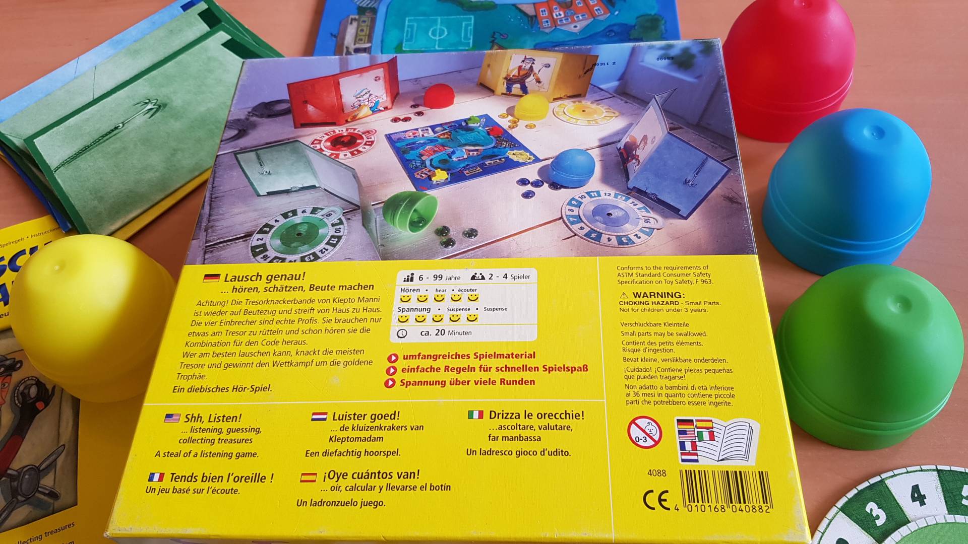 Achtung, die Tresorknackerbande von Klepto Manni ist wieder auf Beutezug und streift von Haus zu Haus. Die vier Einbrecher sind echte Profis. Sie brauchen nur etwas am Tresor zu rütteln und schon hören sie die Kombination für den Code heraus. Wer am Besten lauschen kann, knackt die meisten Tresore und gewinnt den Wettkampf um die goldene Trophäe.