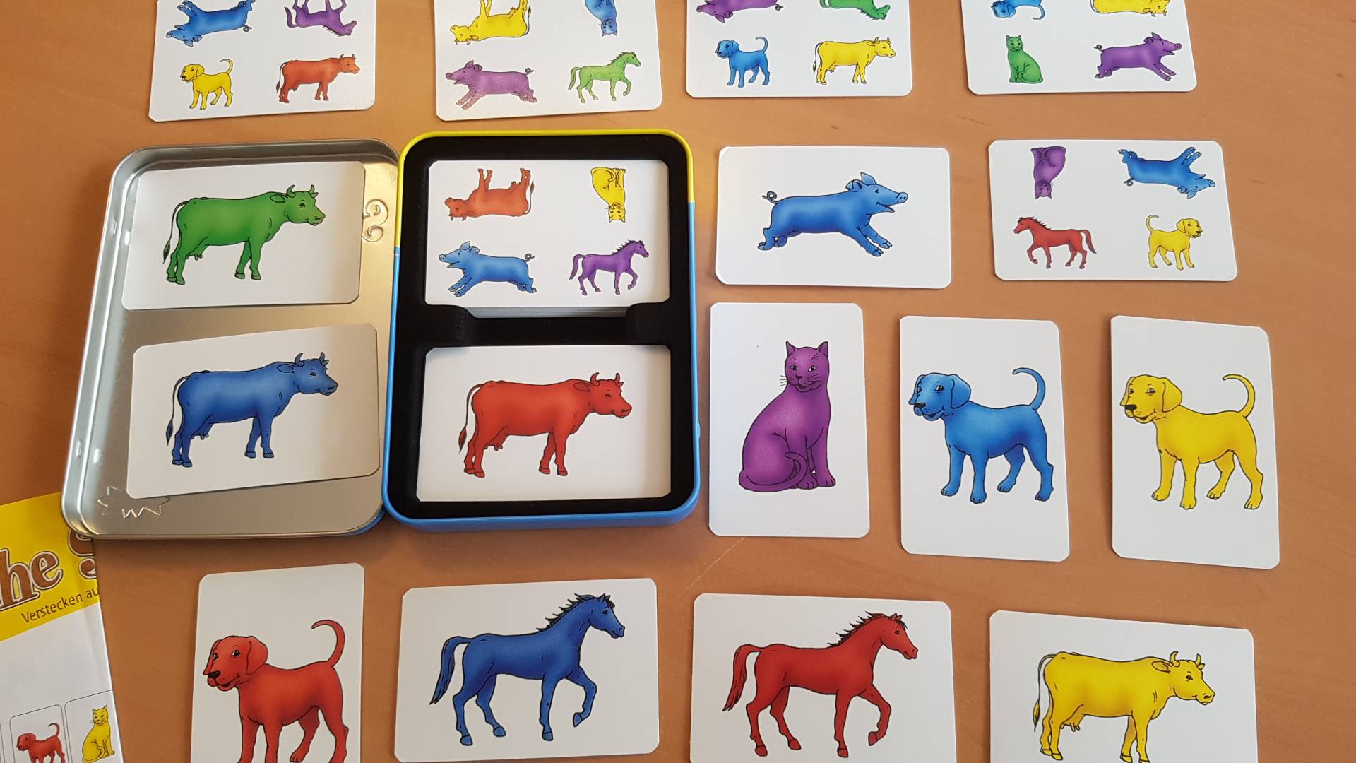 25 Tierkarten mit fünf Tieren in fünf verschiedenen Farben liegen bunt verstreut offen auf dem Tisch. Eine weitere Karte, auf der vier verschiedenfarbige Tiere abgebildet sind, wird aufgedeckt. Nun suchen alle auf dem Tisch nach dem fünften Tier in der noch fehlenden Farbe. Wer es zuerst entdeckt, tippt auf die Karte und erhält sie als Belohnung. Danach wird eine weitere Karte umgedreht und eine neue Runde beginnt. Der Spieler, der am Ende die meisten Tierkarten besitzt, gewinnt das lustige Versteckspiel rund um den Bauernhof.