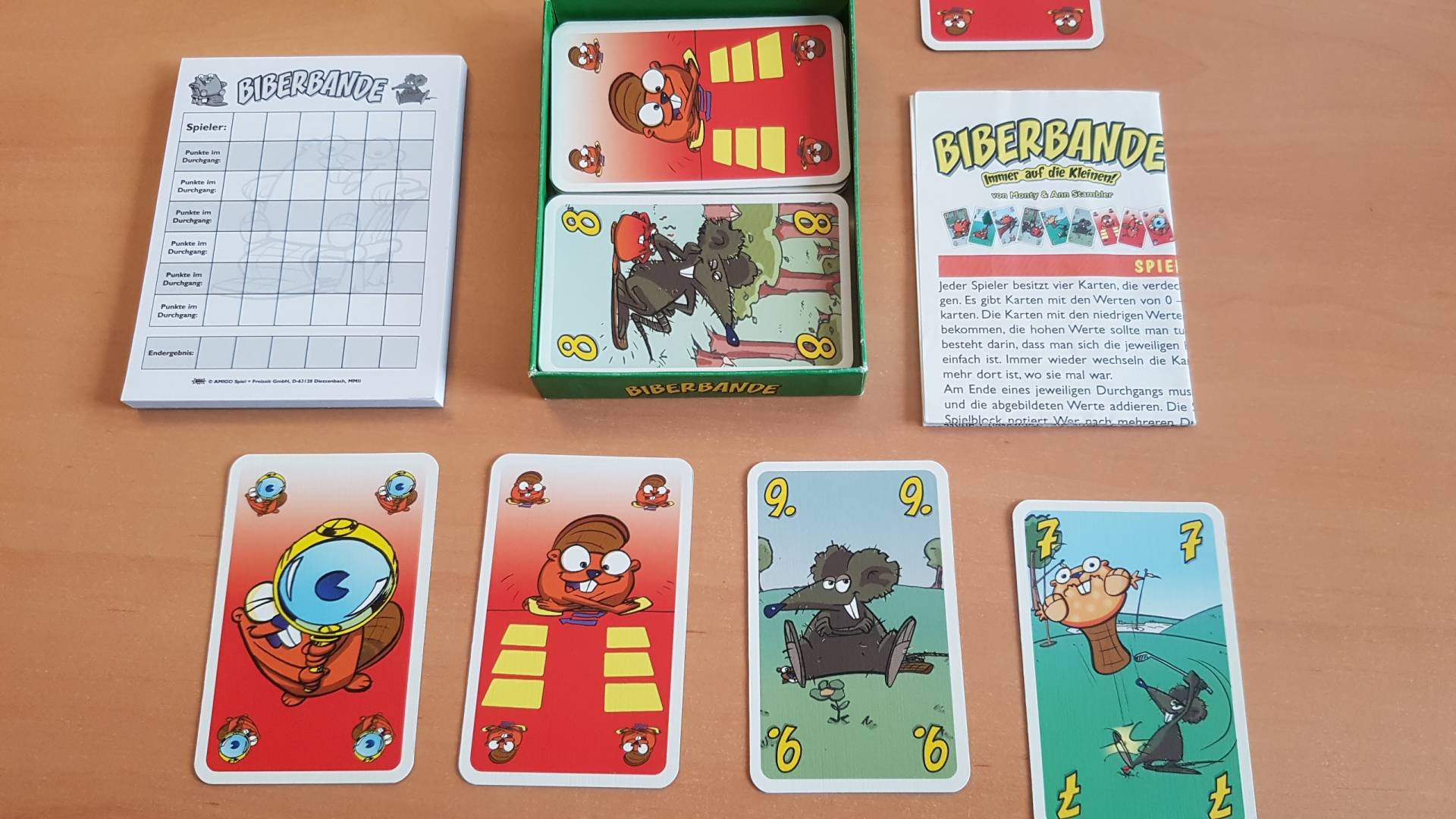 Das Ziel ist klar: Biberkarten mit möglichst niedrigen Werten zu bekommen. Jeder Spieler hat vier Karten verdeckt vor sich liegen, aber nur zwei davon darf er sich zu Beginn ansehen. Danach gibt es nur noch wenige Möglichkeiten, herauszufinden was auf der Vorderseite abgebildet ist. Ist es ein dösender Biber mit niedrigem Zahlenwert oder eine fiese Wasserratte mit hohem Wert, die man loswerden will? Spezielle Sonderkarten erlauben es, sich während des Spiels die ein oder andere Karte anzusehen oder eine schlechte Karte seinen Mitspielern zuzuschieben.