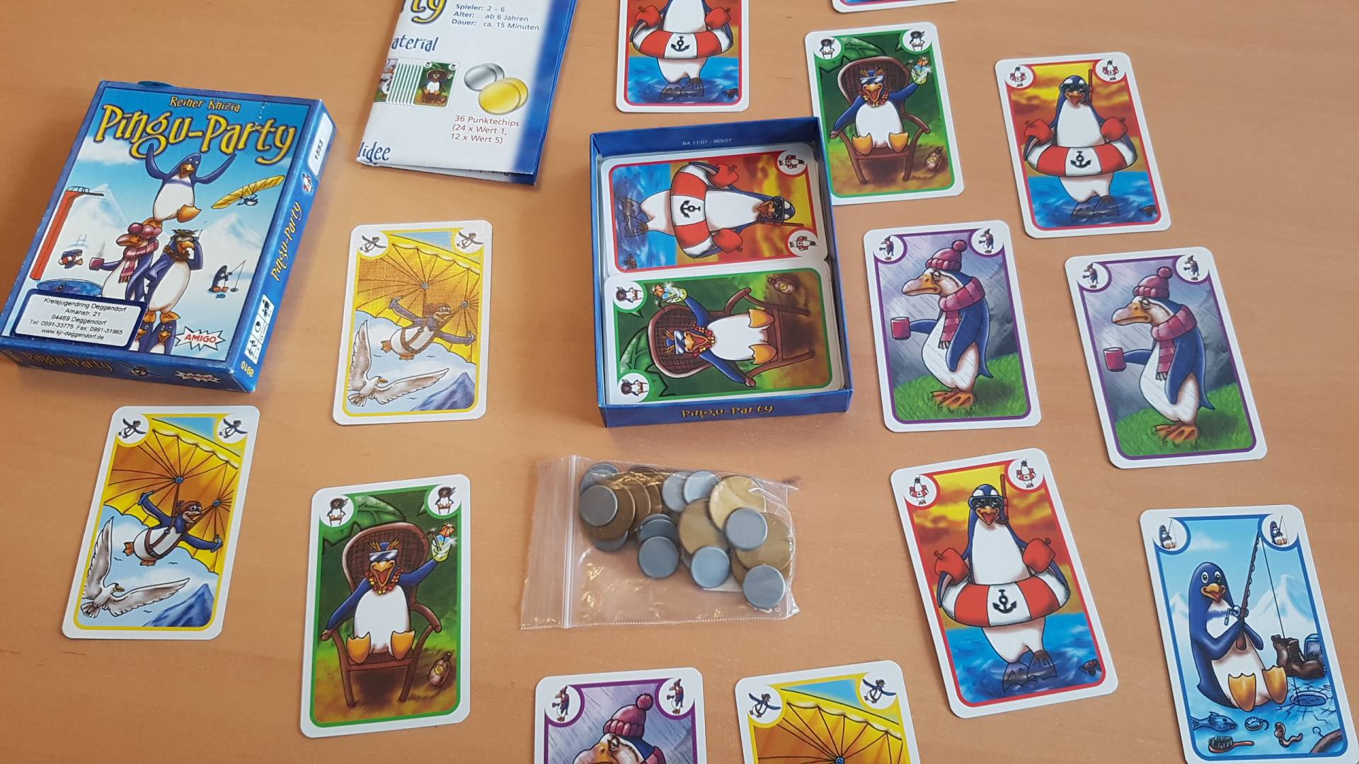 Party bei den Pinguinen. Mit coolen Drinks, frischem Fisch und der großen Pinguin-Pyramide geht die Post ab. Möglichst viele Pinguine müssen in der Pyramide Platz finden, je höher desto besser. Ziel der Spieler ist es, mit ihren Pinguinkarten auf der Hand gemeinsam eine Pyramide zu bilden. Dabei sollte jeder Spieler möglichst viele Karten in die Pyramide ausspielen. Wer zum Ende eines Spiels noch Karten besitzt, kassiert Punktechips. Wer es schafft alle seine Pinguine in der Pyramide unterzubringen, kann Chips abgeben. Gewinner ist nach mehreren Spielen der Spieler mit den wenigsten Chips. So spielt man Pingu-Party: Alle Pinguinkarten werden gemischt und gleichmäßig an die Spieler verteilt. Die Punktechips werden nach Wert geordnet und in die Tischmitte gelegt. Der Startspieler beginnt, danach folgen die Mitspieler im Uhrzeigersinn. Wer an der Reihe ist, spielt einen Pinguin aus und legt ihn offen in die Tischmitte. Der erste Pinguin des ersten Spielers markiert die unterste Reihe. Der erste Pinguin des nachfolgenden Spielers wird links oder rechts direkt daneben gelegt. Welche Farbe diese Pinguine haben, spielt keine Rolle. Für die weiteren Pinguine gibt es zwei Möglichkeiten: Der Pinguin wird in die unterste Reihe gelegt oder der Pinguin kann in eine jeweils höhere Reihe gelegt werden, wenn direkt darunter schon zwei andere Pinguine liegen. Die Farbe des neuen Pinguins muss mit der Farbe eines Pinguins übereinstimmen, der direkt darunter liegt. Im Laufe des Spiels entsteht eine Pinguin-Pyramide aus acht Reihen. Die unterste Reihe besteht aus acht Pinguinkarten. Jede Reihe nach oben hat jeweils eine Pinguinkarte weniger. Wer an der Reihe ist und keinen Pinguin ausspielen kann, scheidet aus und erhält so viele silberne Chips, wie er noch Pinguine auf der Hand hat. Wer seinen letzten Pinguin ausspielen kann, darf zwei seiner Chips wieder abgeben. Ein Spiel ist beendet, wenn alle Spieler ausgeschieden sind oder all ihre Karten ausspielen konnten. Es werden so viele Spiele gespielt, wie Spieler teilnehmen.