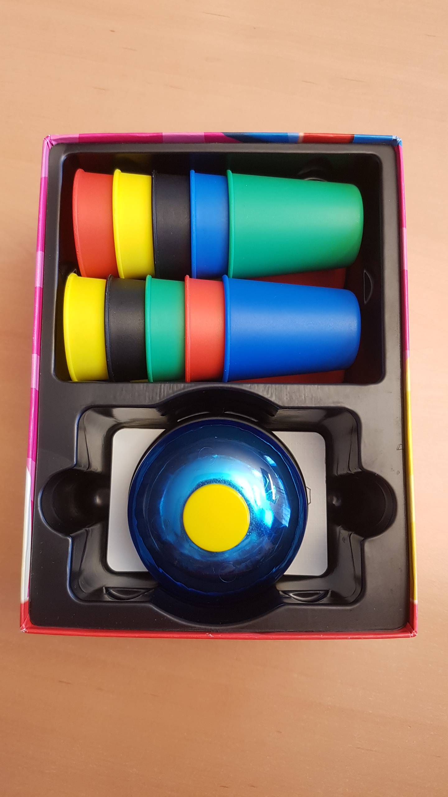 Jeder Spieler bekommt einen Satz Cups in den Farben Blau, Rot, Grün, Schwarz und Gelb. Die Glocke steht in der Tischmitte. Die Aufgabenkarten werden gemischt und verdeckt als Stapel neben die Glocke gelegt. Schon geht es los und die erste Karte wird umgedreht. Die Karten geben vor, ob die Cups gestapelt werden oder nebeneinander stehen. Welcher Vogel sitzt oben im Baum, welcher unten? In welcher Reihenfolge hängen die bunten Jacken an der Wand? Cups richtig? Dann schnell auf die Glocke hauen! Jetzt wird nachgesehen, ob die Reihenfolge der Cups stimmt. Alles richtig? Dann darf der Spieler die Karte behalten. Oder wurde ein Fehler gemacht? Der nächstschnellere Spieler bekommt eine Chance, mit der richtigen Cups-Anordnung die Karte zu gewinnen. Danach geht es mit der nächsten Karte weiter. Sind alle Aufgabenkarte verbraucht, gewinnt der Stapelkünstler mit den meisten Karten.