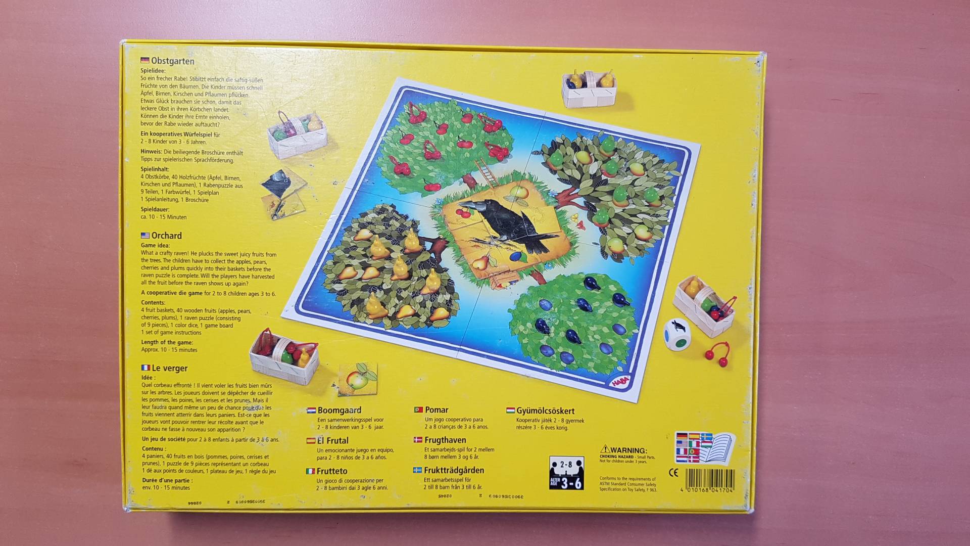 Der bekannte HABA-Spieleklassiker Obstgarten darf in keinem Kinderzimmer fehlen. Gemeinsam können die Kinder die leckeren Früchte ernten und schneller sein als der freche Rabe Theo. Leicht verständliche Spielregeln garantieren allen kleinen Obstgärtnern schnellen Spielspaß. Das witzige Farbwürfelspiel Obstgarten enthält einen liebevoll gestalteten Spielplan, auf dem der freche Rabe und vier Obstbäume abgebbildet sind. Außerdem gibt es je Baum 10 leckere große Früchte aus Holz, die sich den Bäumen auf dem Spielplan zuordnen lassen. Nach dem Würfeln dürfen die Kinder eine farblich passende Frucht ernten und in ihre Körbe legen, das schult das erste Erkennen und Zuordnen von Farben. Zeigt der Würfel den frechen Raben Theo, wird eins von neun Puzzleteilen auf den Spielplan gelegt. Schaffen es die Kinder die Bäume abzulesen, bevor das Rabenpuzzle komplett ist, haben sie gemeinsam gewonnen. Das stärkt das Wir-Gefühl der Kinder.