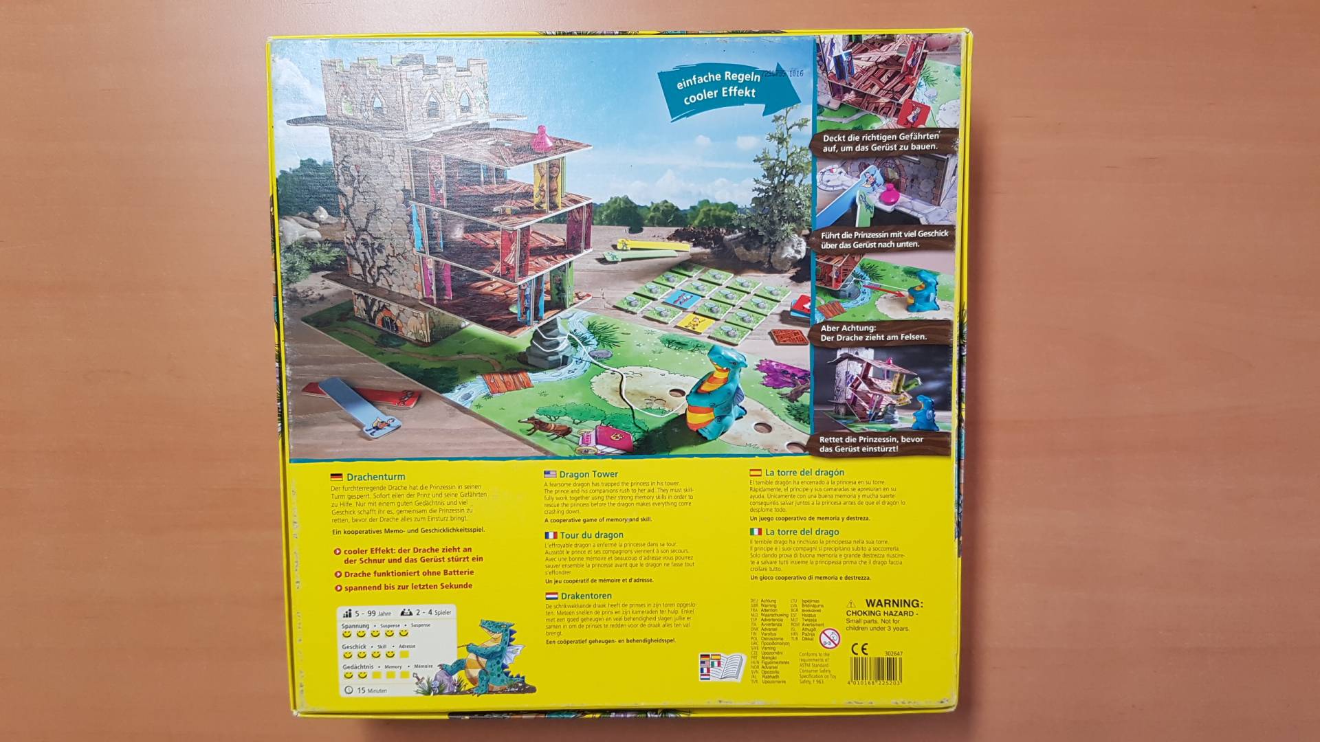 Drachenturm ist ein spannendes Kinderspiel für 2 bis 4 unerschrockene Helden von der ersten bis zur letzten Sekunde. Es verbindet Elemente eines Memo- und eines Geschicklichkeitsspiels mit einem spektakulären Spielaufbau. Der Clou ist der coole Drache, der langsam, aber sicher am Fundament des Gerüsts zieht und so dieses kooperative Abenteuer zu einem Wettlauf gegen die Zeit macht.