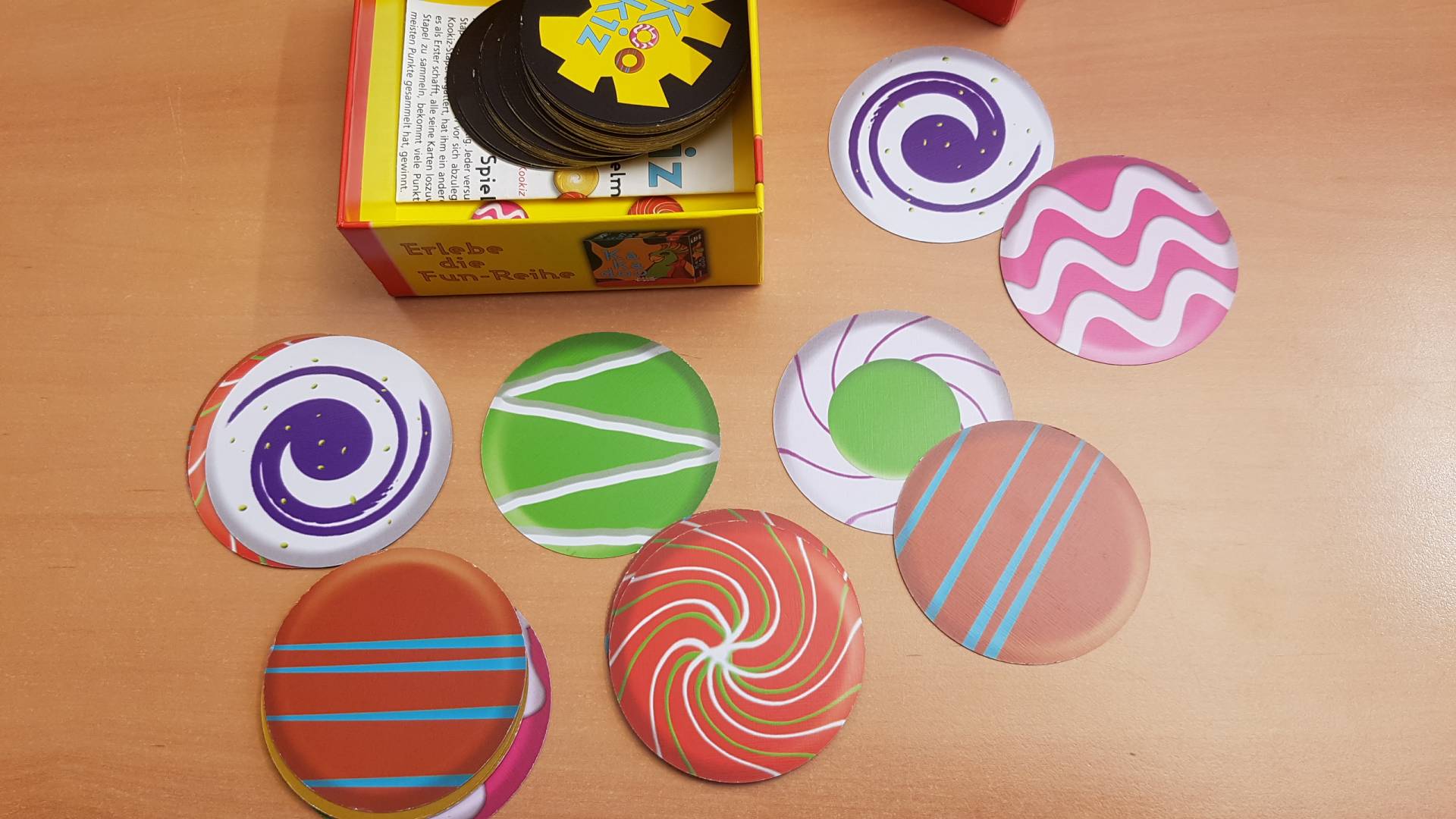 Gleiche "Kookiz" ergattern, schnell den anderen Mitspielern wegschnappen und als Erster alle Karten loswerden! So leicht ist Kookiz erklärt und so lustig gespielt. Noch turbulenter wird das Ganze dadurch, dass alle Spieler gleichzeitig spielen und sich gegenseitig die Kookiz wegschnappen. Wer es als Erster schafft alle seine Karten loszuwerden und gleichzeitig noch die meisten Kookiz-Stapel vor sich sammeln konnte, bekommt dafür als bestes Krümelmonster die meisten Pluspunkte. Wer es nach fünf Runden schafft die meisten Siegpunkte zu ersammeln, geht als Sieger aus Kookiz hervor!