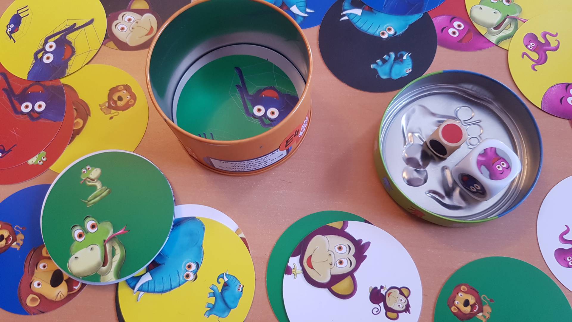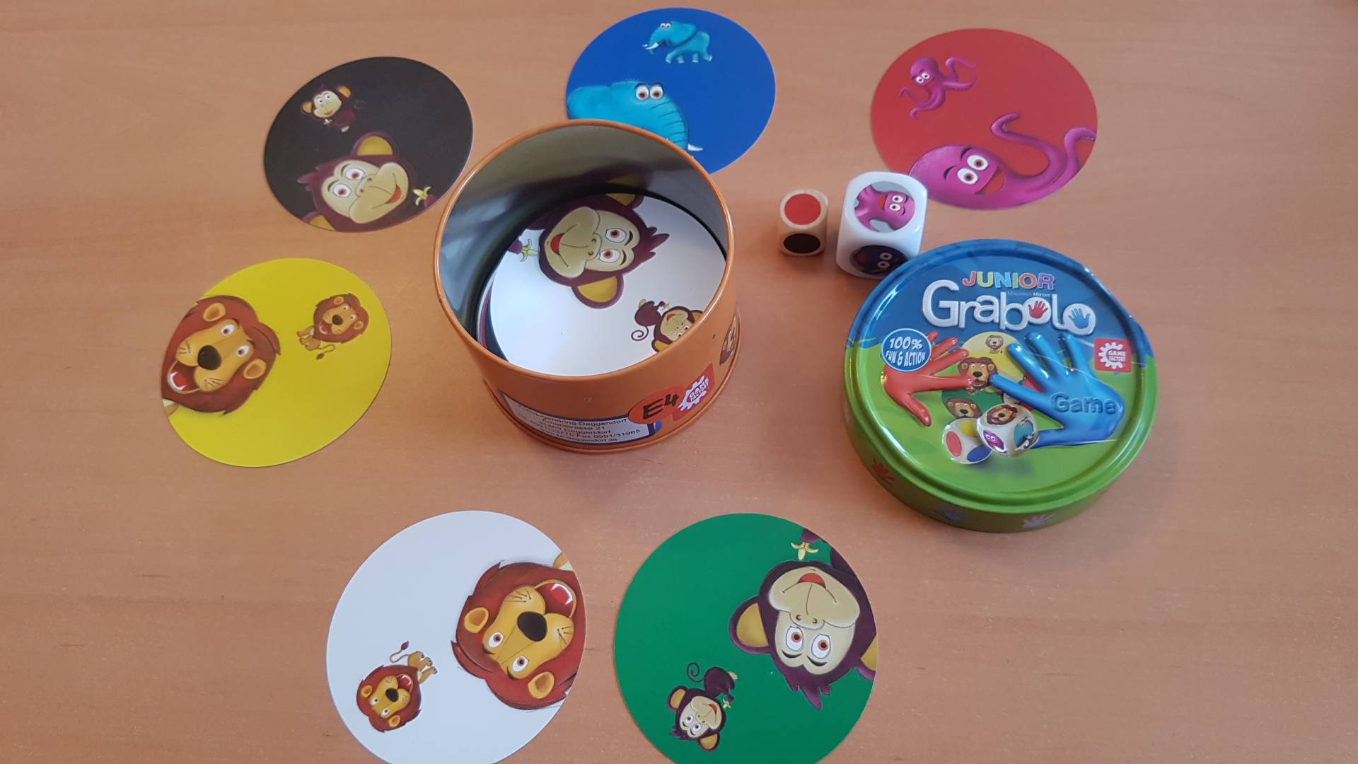 Schauen, grabschen und einfangen – jetzt kommen auch die kleinsten Spieler auf ihre Kosten: Mit dem neuen «Grabolo Junior» geht die turbulente Kartenjagd in die zweite Runde – die Tiere sind los! Es geht um das schnelle Erkennen der gesuchten Karten. Sie sind rund, bunt und stabil. Farbe und Tier geben die beiden Würfel vor. Diese attraktive Metalldose ist ein perfektes Mitbringsel für jede Kinder-Geburtstagsparty.